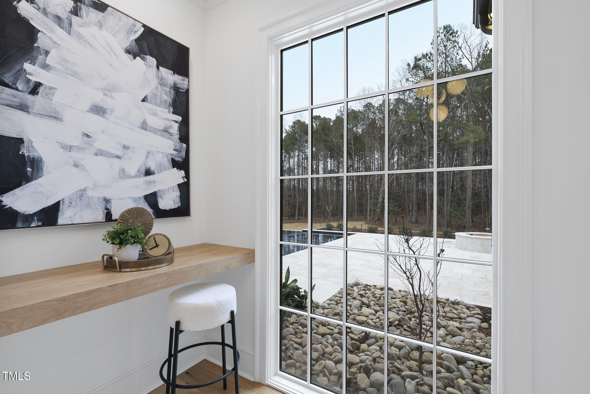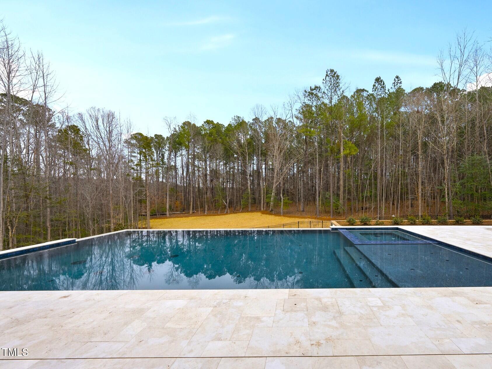 Stunning Custom Residence by Midtown Custom Homes! Located in North Raleigh's Exclusive Shinleaf Estates! Nestled against the serene wooded buffers surrounding Falls Lake. This home blends Luxury and nature seamlessly. Upon entering, you're greeted by an inviting foyer that leads to a spacious Family Rm with a bespoke bar featuring walnut lining to continue the natural wood accents throughout this space. A gourmet kitchen w/scullery boasts a Large island w/custom cabinetry, perfect for culinary creations and casual gatherings. Expansive Design includes 5 BR's each w/exquisite baths, master suite offering a private sanctuary for comfort. Upstairs, discover a versatile loft & Rec Rm ideal for entertaining or relaxing. The magic continues with a covered porch overlooking a raised pristine pool w/infinity edge waterfall creating an idyllic setting for alfresco dining or serene morning coffee. This isn't just a residence; it's a Lifestyle! Embrace the harmony of Luxury Living!